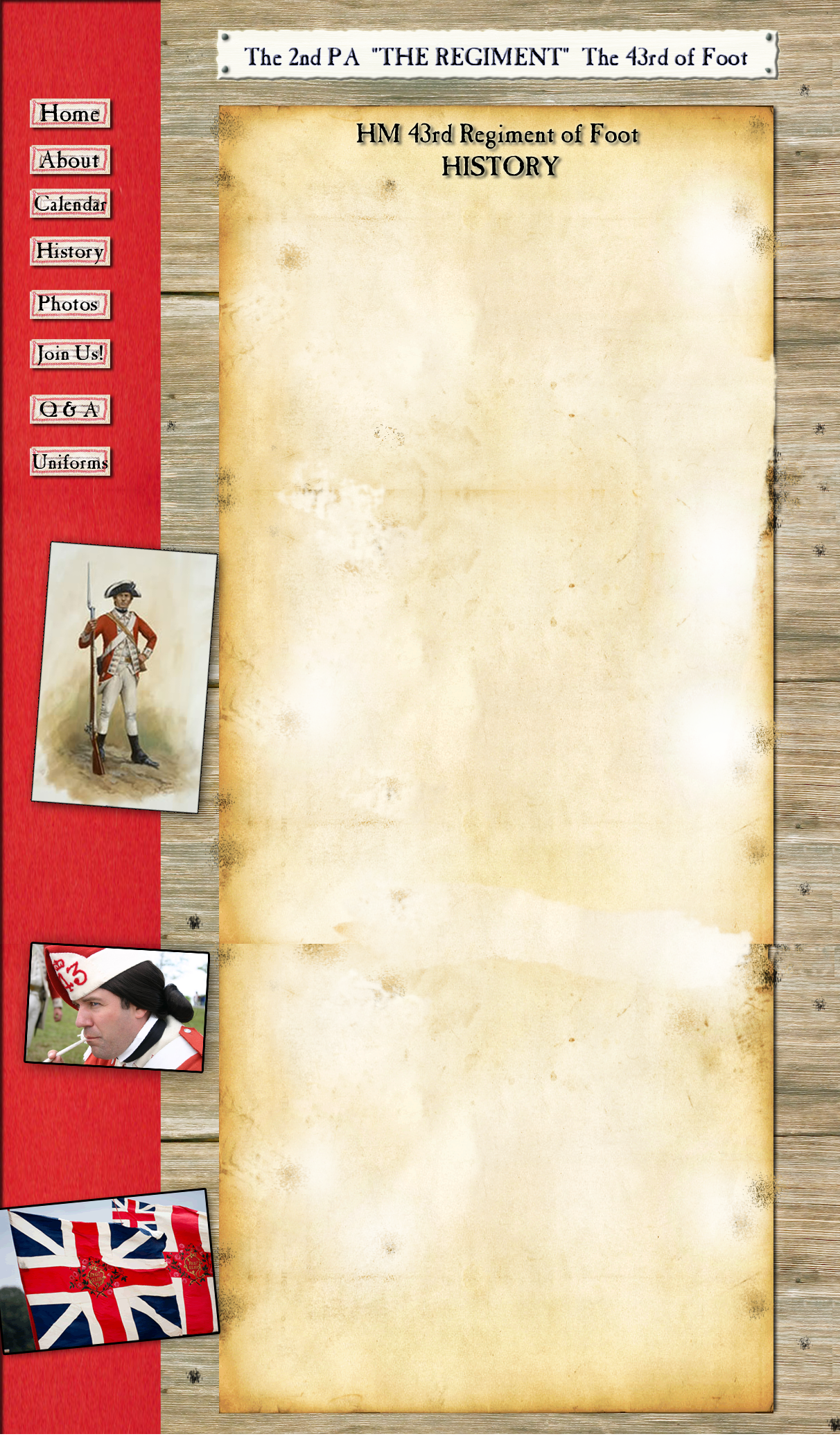 The 43rd Regiment of Foot was raised in 1741. Its first visit to America was in June,1757 when it arrived off Halifax to participate in the French and Indian War. In September, 1759 it was the center of Gen. Wolfe's line on the Plains of Abraham before Quebec and won acclaim for its bravery and discipline in that British victory. In July, 1762 it again distinguished itself at the storming of Havana, Cuba. Afterwards, it was stationed in Jamaica, where it remained until March, 1764 when it sailed back to England.
